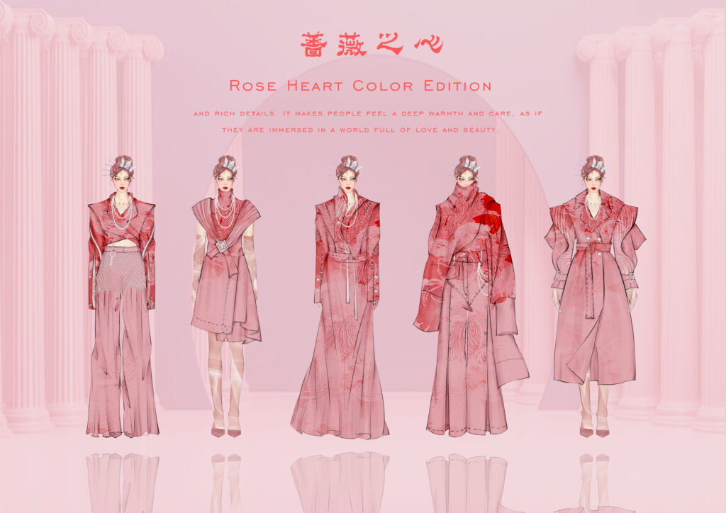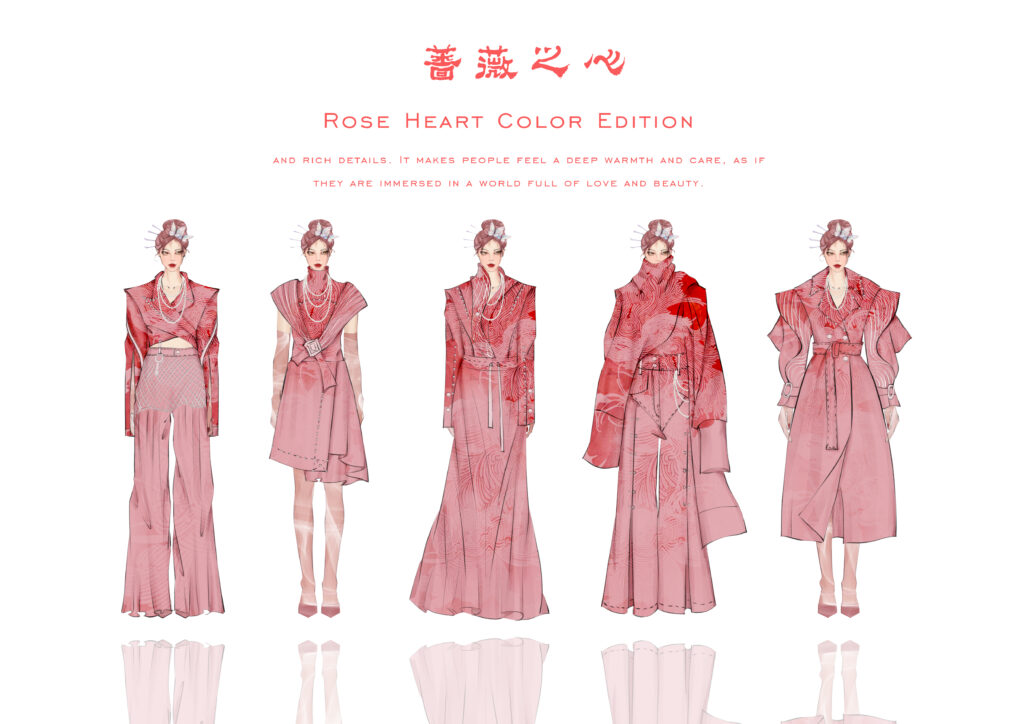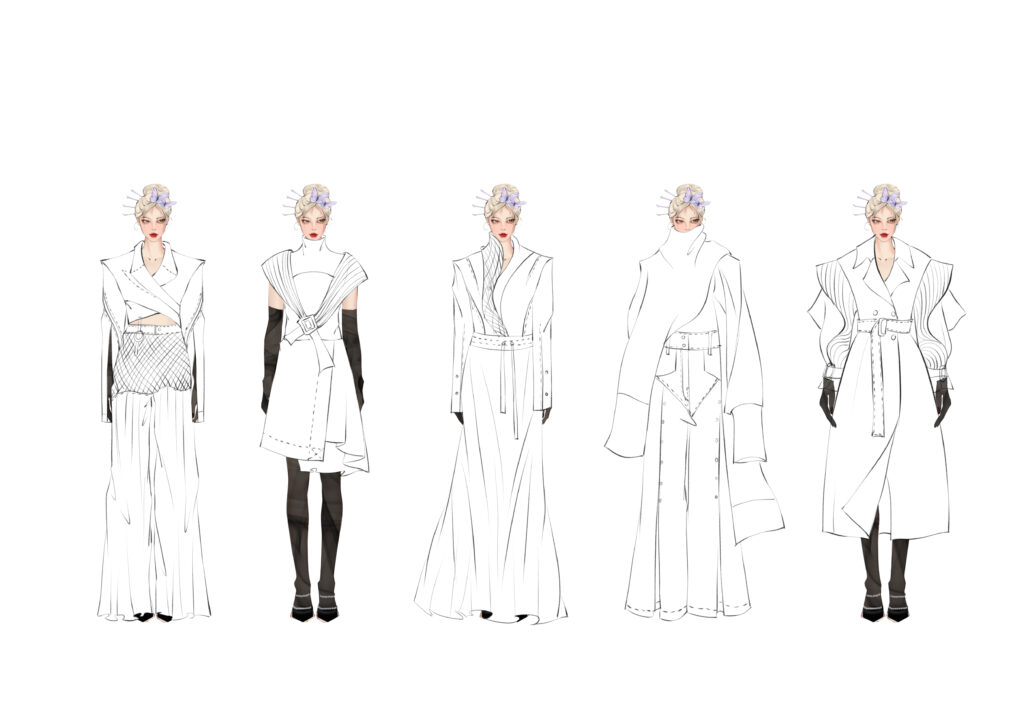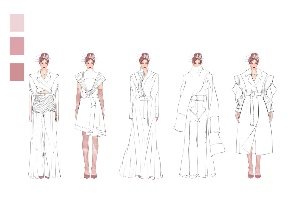 The series begins with pure white, in the simple line sketches, the application of white and fluid comonst of the garments are precisely defined, as if the inspiration had swept into paper, focusing on the authentie style of structure and form.